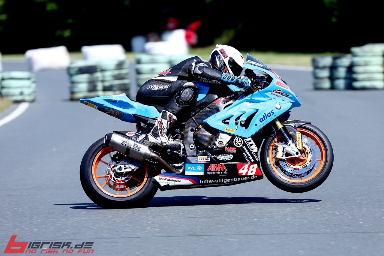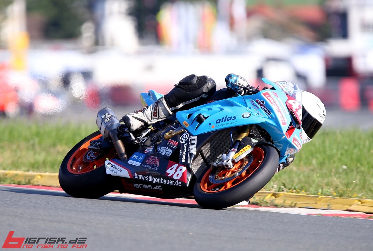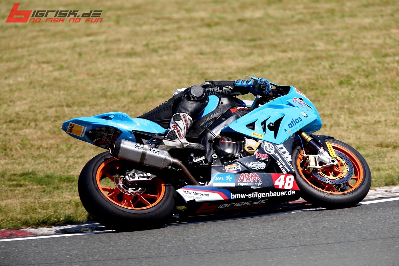 Schleiz: Hitzeschlacht ... 38 C° ... Q1 nicht optimal ... Qualifyer hat nicht gut gepasst ... P4. Q2 top, aber bei der Mittagshitze nicht mehr die Zeiten der ersten 3 unterbieten können ... Rennspeed top mit Rennreifen. Im Rennen dann bei tropischen Temperaturen auf Platz 1 gefightet ... endlich der verdiente Lohn. Race 2 ... schwierig, da die SBK-Piloten Smrz und De Boer im SST-Pulk mitten drin waren und Dominik trotz Top-Zeiten nicht zum Angriff kam. Zum Schluss dann noch von der 1199 von Marc Moser (Gaststarter FIM Superstock) abgefangen worden. Platz 3 ... aber 45 Punkte und zurück in der Meisterschaft auf Platz 3 vor Bovee (Alpha-Racing).
