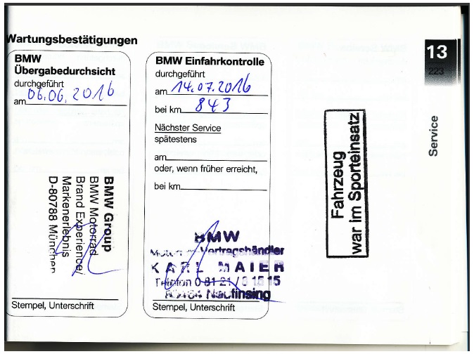 Die Einfahrkontrolle ist von BMW-Motorradhändler Karl Meyer in 85464 Neufinsing abgestämpelt.