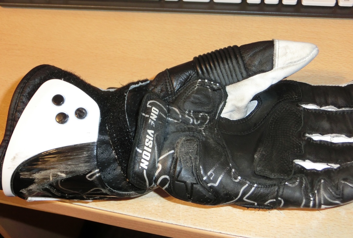 aus und wieder anziehen von einem Rennstreckenhandschuh mit viel Gefühl für das Motorrad,