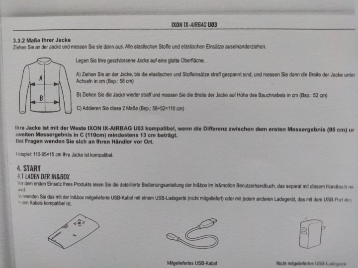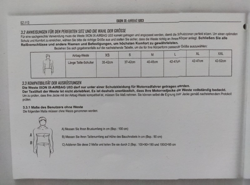 Die Hilite ist zum drüber tragen und hat ein viel größeres Airbag Volumen....glaube ca 20 Liter, die IXON hat 12 Liter. Ist zum unter der eigenen Jacke tragen. Welche Deiner alten Jacken passen musst Du ausmessen. Bei Dir selbst Deinen Brustumfang und Hüftumfang. Dann Deine Jacken zwar von Naht zu Naht maximal gestretcht. Ich Stelle hier Mal die originale Anleitung aus meinem Handbuch rein. Das untere Bild ist der erste Teil. Das obere Bild der zweite Teil der Anleitung. Quelle IXON. Die Formel gilt somit auch nur für die IXON Weste. Keine Garantie wie weit das für die Tech Air 5 gilt. Vermutlich aber ähnlich. Eigentlich ist das Ausmessen welche Jacke passt recht easy. Bei Textiljacken viel Platz, Selbst bei meiner alten Vanuchi Lederkombi geht es.