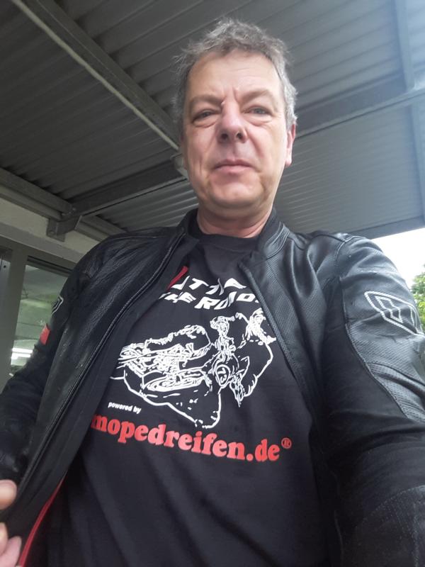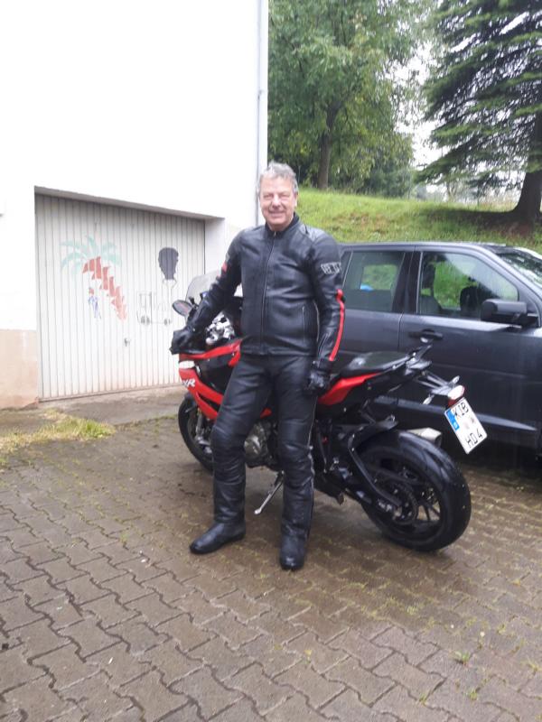 Da haben sich die Regentropfen auf den Textilbereichen an den Oberarmen angefühlt wie Nadelstiche. Jeder Treffer ein kleines Aua. Aber Zuhause hab ich festgestellt, dass da alles trocken war. Eigentlich hab ichs von meiner Frau feststellen lassen, ich hatte ja extra Sommerhandschuhe nur aus Leder ohne Membran getragen, weil ich wissen wollte, ob der Regen auch tatsächlich stark genug war, um Leder zu durchnässen. Kurz nach dem Losfahren hab ich das dann aber für ne blöde Idee gehalten. Aus dem "bisschen Regen" wurde ein ausgewachsener Pfälzer Landregen, teilweise konnte das Wasser nicht mehr schnell genug von der Fahrbahn ablaufen und es bildeten sich so kleine Bächlein.