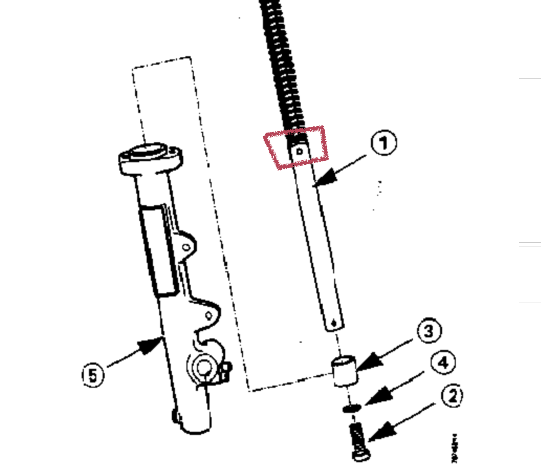 Also wenn ich die Federvorspannung erhöhe, bewege ich den Bolzen (aufm Bild im Kasten) nach oben, so, dass die Feder nach oben mitgeht und das Tauchrohr somit nach unten "rausgedrückt" wird. Wenn ich die Federvorspannung rausnehme, also weniger mache/entspanne, geht der Bolzen nach unten und das Tauchrohr "taucht" in den Holm nach oben ein.