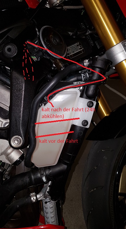 Jetzt besteht das Problem das nach jeder Fahrt der Ausgleichsbehälter zu viel Kühlmittel drin hat, das heisst wenn der Kühlmittelstand vor der Fahrt mittig ist, dann ist der Stand nach der Fahrt wenn das Motorrad wieder abgekühlt ist über Maximum.