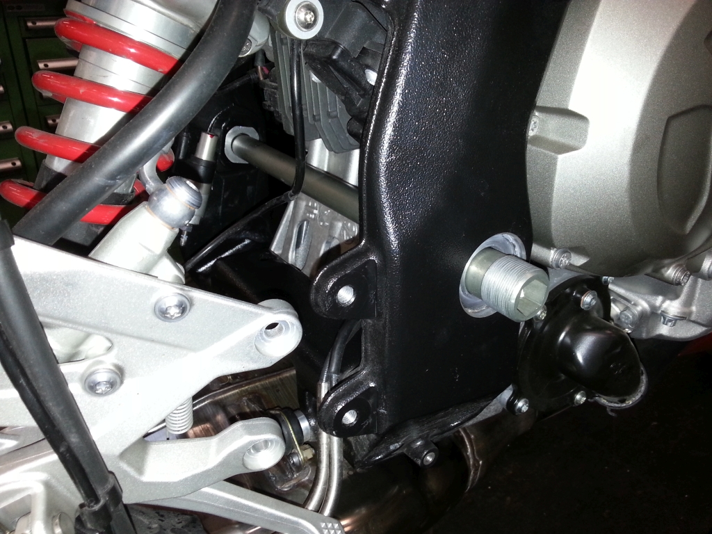 Ziel war, die Schwingenlagerung zu optimieren. Tatsächlich erkannte der Lagerpapst, ohne zu demontieren, dass mit der Schwingenachse was nicht gut gemacht ist. Auf der rechten Rahmenseite sah er keine Kontermutter. Das bedeutet, dass die Schwingenachse rechts lediglich im Gewinde und in einem sehr großzügig ausgelegten Passsitz hängt und dort entsprechend arbeiten kann!