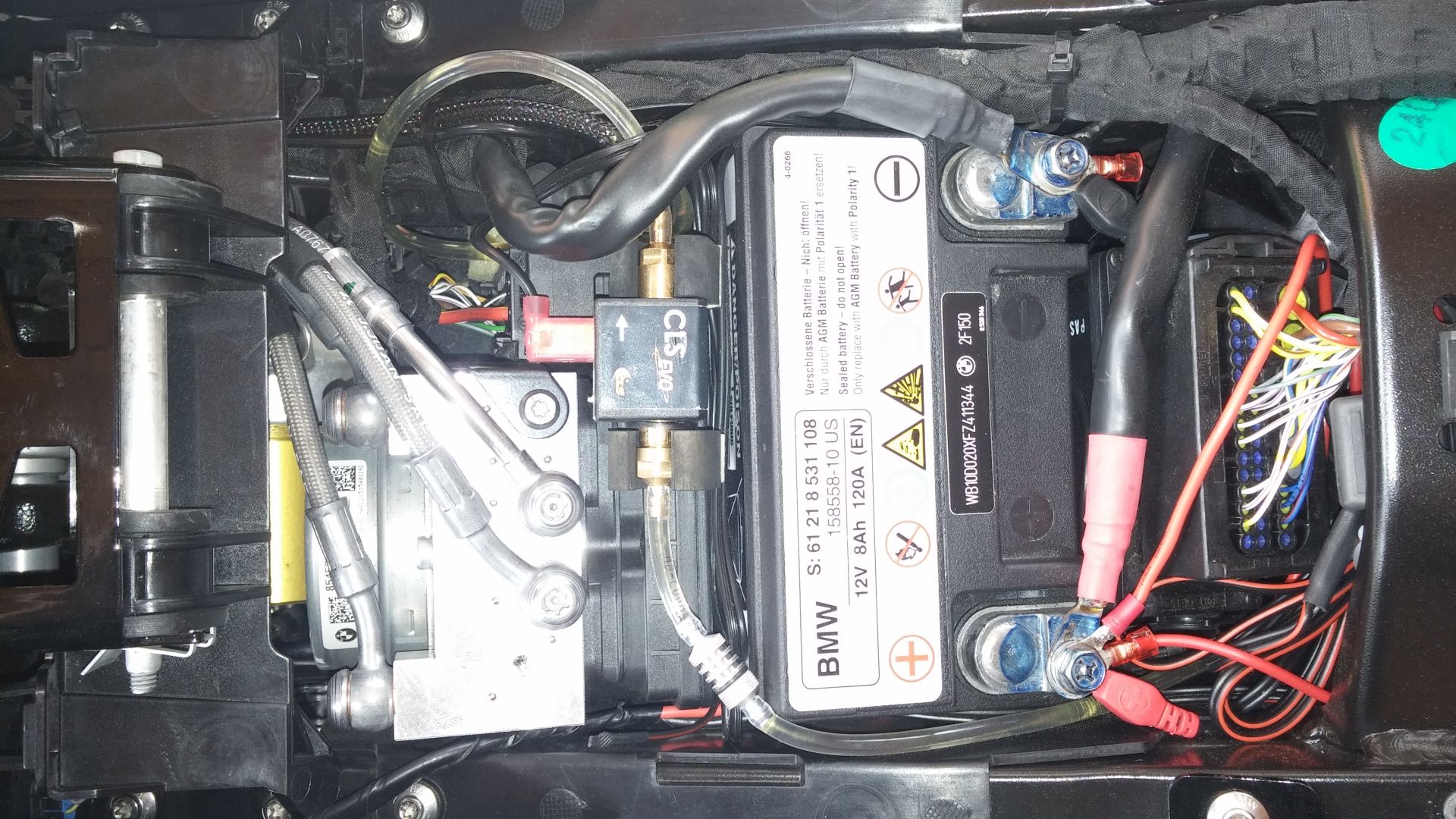Der Tank im Heck vor dem Sicherungskasten. Für das Bordwerkzeug und Verbandszeug ist Platz frei weil alles Blinker relavante nach rechts außen verlegt wurde.
