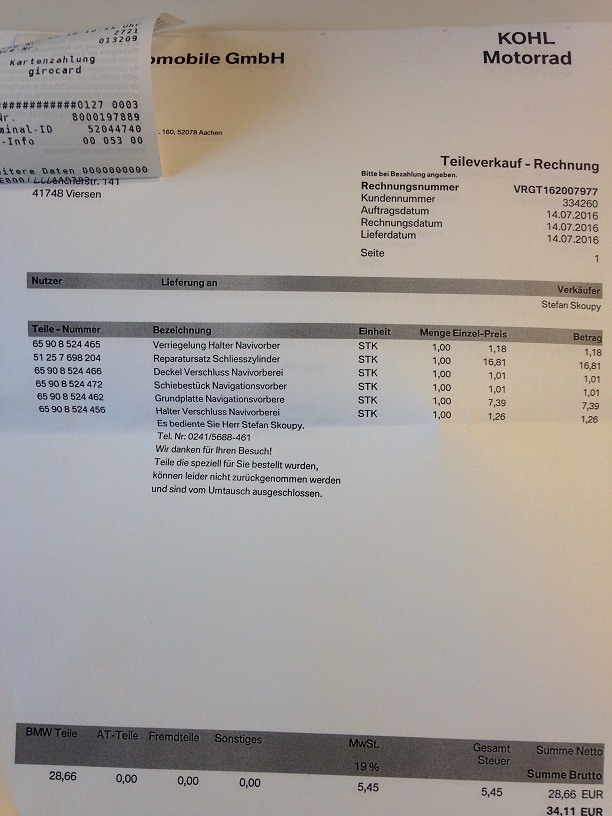es waren insgesamt 8 Teile von der RS verbauten und abschließbaren Navi Halter, alles zusammen Cent Artikel. Das teuerste war das Schloss mit 20 € in Gleichschließung.