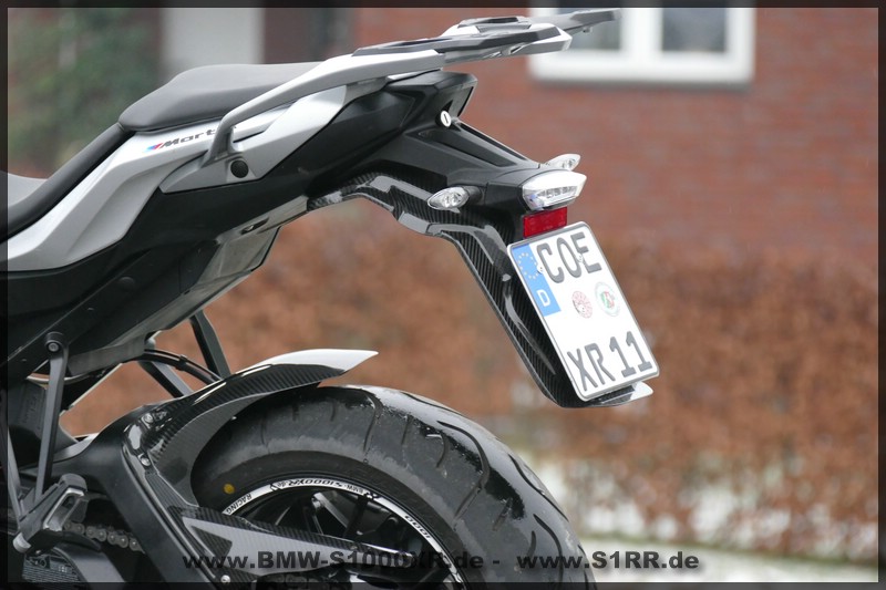 Hier mal ein Bild, zwar ist der Spitzschutz aus Carbon, sonst aber identisch zum Normalen. Der Nummernschildträger ist seitlich nur 4mm größer als das Nummernschild und sitzt untern Nummernschild. Passt also mit Spritzschutz. Einzig das Nummernschild sitzt jetzt durch den Kennzeichenhalter darunter ca. 10mm weiter "hinten".