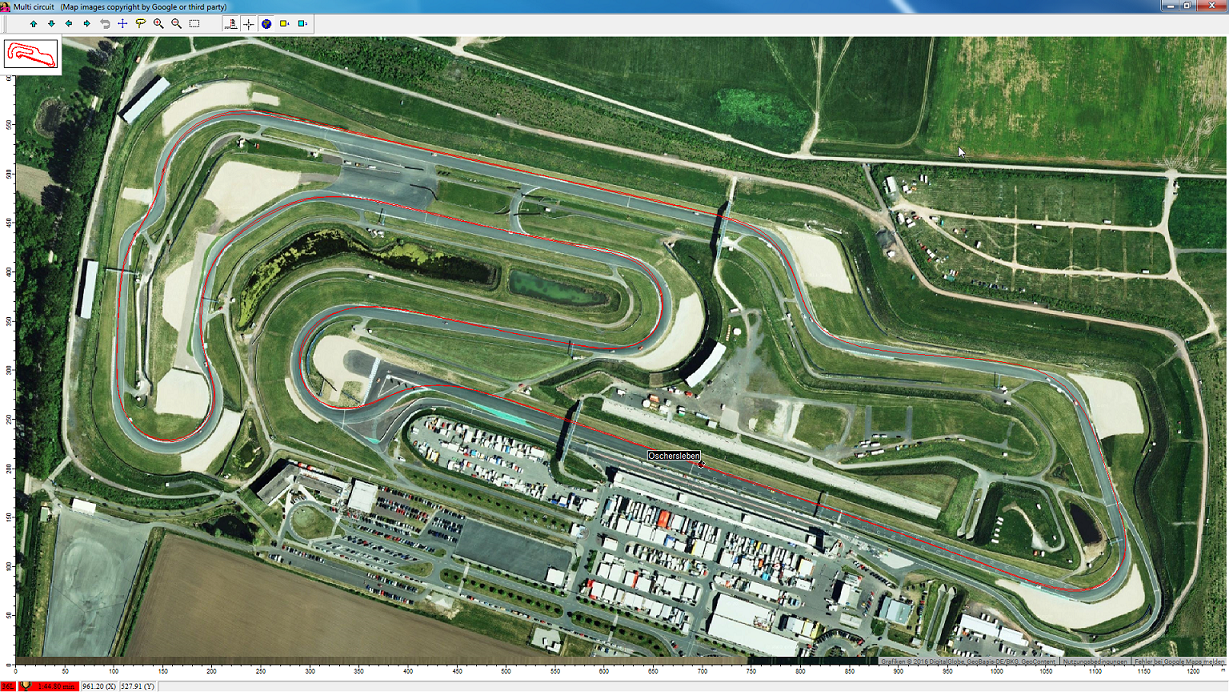 Im Multi-Circuit View wird bei mir das Kartenbild für Spa Francorchamps nicht vollständig von Google Maps geladen. Ich habe bereits versucht die Datei "GMSat_Zoom=18_Lon=5.96560816_Lat=50.44503738_XMeter=1557.67_YMeter=1557.67_Spa.BMP" aus dem tmp-Verzeichnis zu löschen, damit die Ansicht beim Programm-Neustart neu geladen wird. Leider ohne Erfolg. Mit Oschersleben oder dem Hockenheimring habe ich das Problem nicht (siehe unten).