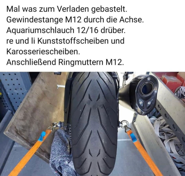 Luiji93 hat geschrieben:Hat das schon mal jemand ausprobiert mit der Gewindestange und den Ringmuttern? Im Endeffekt werden so ja auch die Motorräder von den Herstellern transportiert, also sollte das grundsätzlich eine Gute Lösung sein. Und die ungefederte Masse beim Transport wird deutlich verringert.
