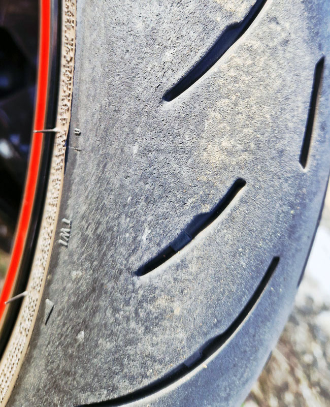 Nach 500 zügigen bis sehr zügigen Landstrassen-Kilometern sind ca. 20% der nutzbaren Profiltiefe bereits aufgeschnupft.