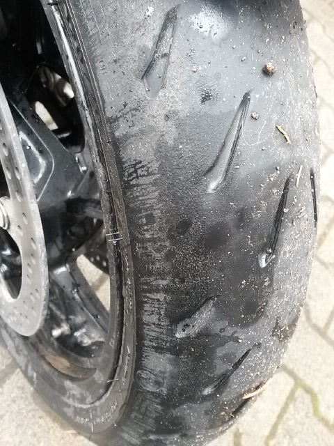 Kurz und gut, bis wir wieder zuhause waren, die letzten 600 Kilometer ab ungefähr kurz nach Garmisch, waren wieder über die Autobahn und ich habe mich dann dazu entschieden, den Reifen zu demontieren. Nochmal der Anfangskilometerstand war 31 280 km, beim Endstand von 38360 war das also eine LAufleistung von 7080 km. Hört sich für einen Sportreifen sehr viel an, man darf aber nicht vergessen, dass über 5000 km davon auf der Autobahn absolviert wurde. Bis auf die Heimfahrt waren das zwar meistens Geschwindigkeiten zwischen 160 und 180 km/h, aber eben im Vergleich zur Landstraße recht wenig Kurven anbremsen und aus der Kurve rausbeschleunigen ...