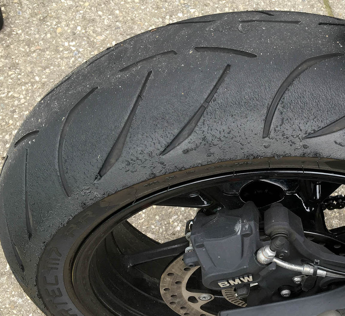 Auch das Reifenbild sah bei dem gleichen Motorrad, der gleichen Pace, der gleichen Fahrwerkseinstellung nur mit unterschiedlichem Luftdruck (Unterschied 0.6 bar )komplett gleich aus