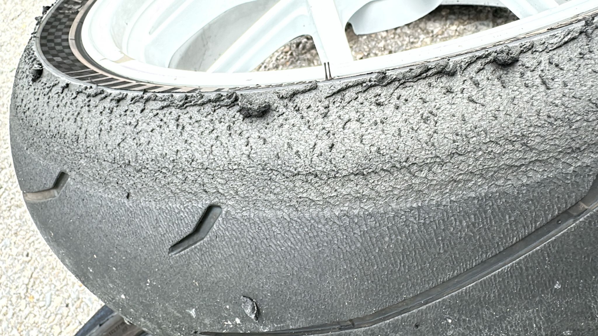 Im vorliegenden Fall vermute ich mal, dass der GP2 Reifen bei den kühlen Temperaturen von Track und Luft (Kai sagt es waren 18°) zu früh rangenommen wurde, bevor alle Gummibereiche ordentlich durchgewärmt waren. Die Stellen die aussehen, als hätte jemand mit nem Esslöffel Vanilleeis aus der Packung gekratzt hat sind wohl die rußhaltigen Gummischichten auf den silika-haltigen, die da fehlen.