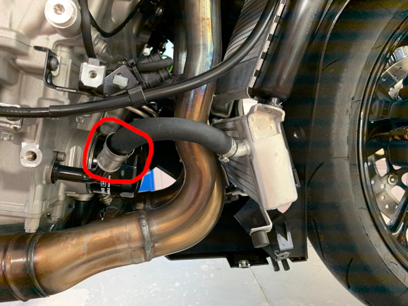 Unten rechts am Motor ist ein Flanschrohr angeschraubt, an diesem ein gebogener schwarzer Schlauch aufgepresst, dieser führt im leichten Bogen um den Krümmer herum zum unteren rechten Ende des Ölkühlers. Problem ist der gebogene Schlauch und die Pressung. Am Ölkühler sitzt eine Schlauchschelle. Wahrscheinlich ist der Radius des Schlauches zu klein. Ich könnt ja mal ein Foto von meiner machen. Habe nun 2054 km u.a. Nordschleife und Assen mit V.R.A. und alles funktioniert.