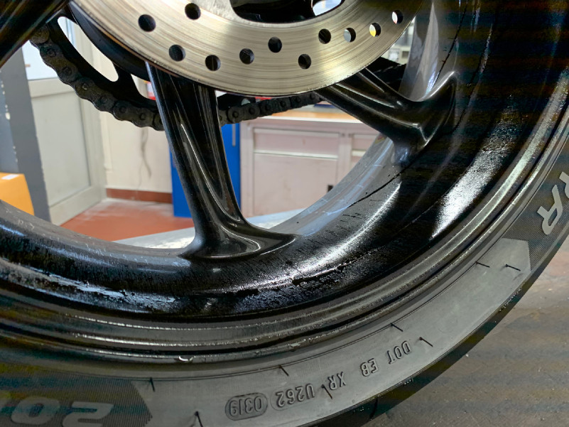 Komplette rechte Seite des Hinterreifens verschmiert. Felge, Auspuff, Schwinge, usw.