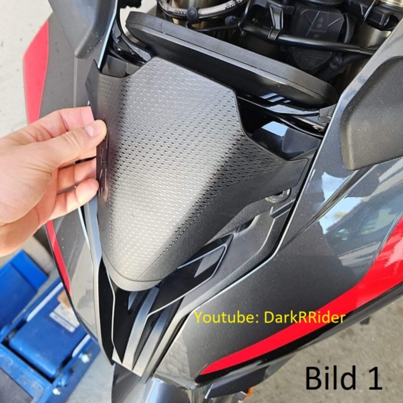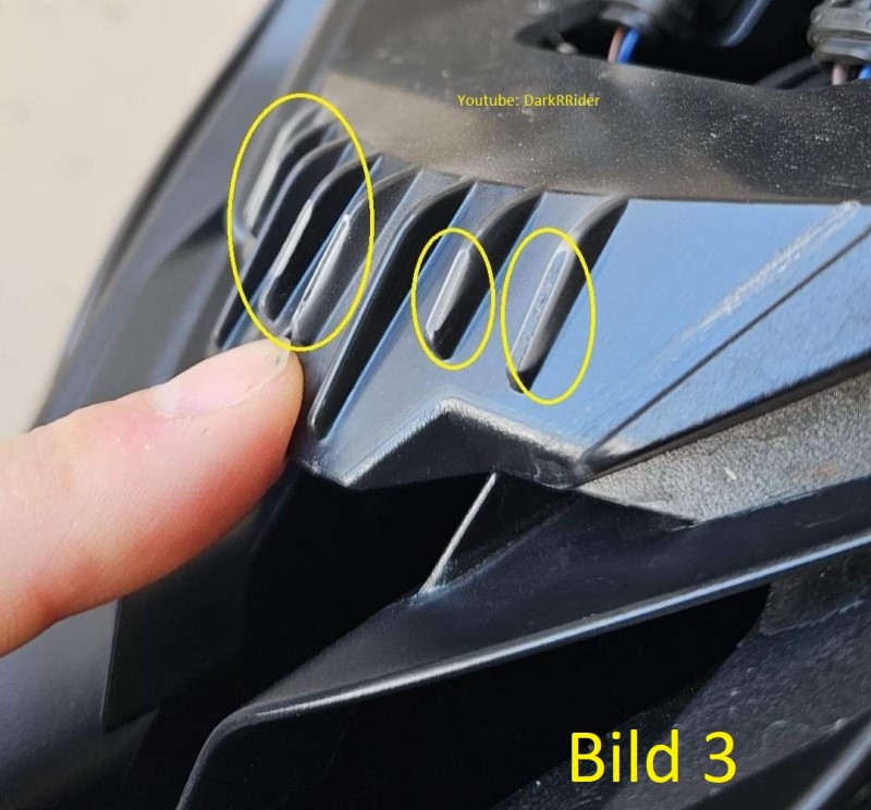 Diese schwarze Verkleidung vorne unter dem Windshild (Bild1) ist oben mit Haken in Gummis drin.