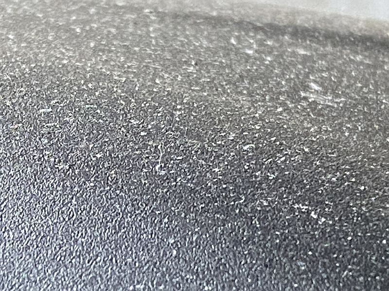 Habs jetzt nur mit bloßem Auge betrachtet. Sehr rauh, reisst Fussel aus Lappen und lässt sich mit nix abwaschen. Wie sandgestrahlt... :(