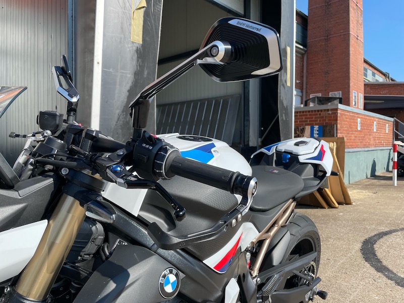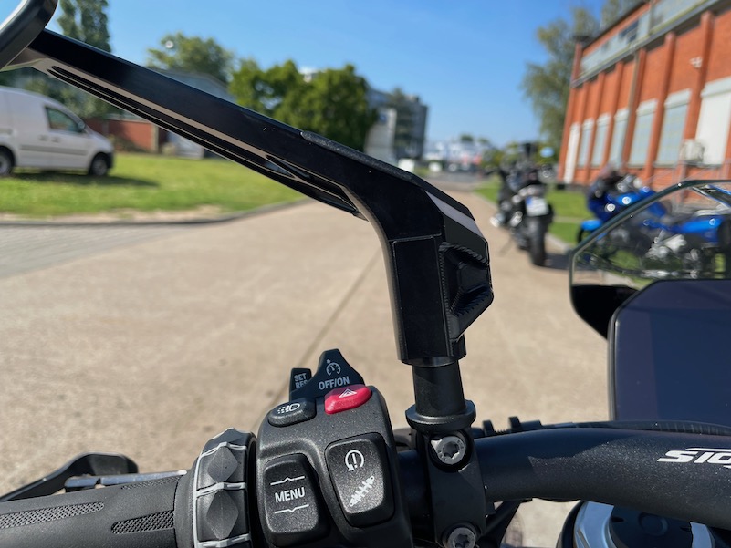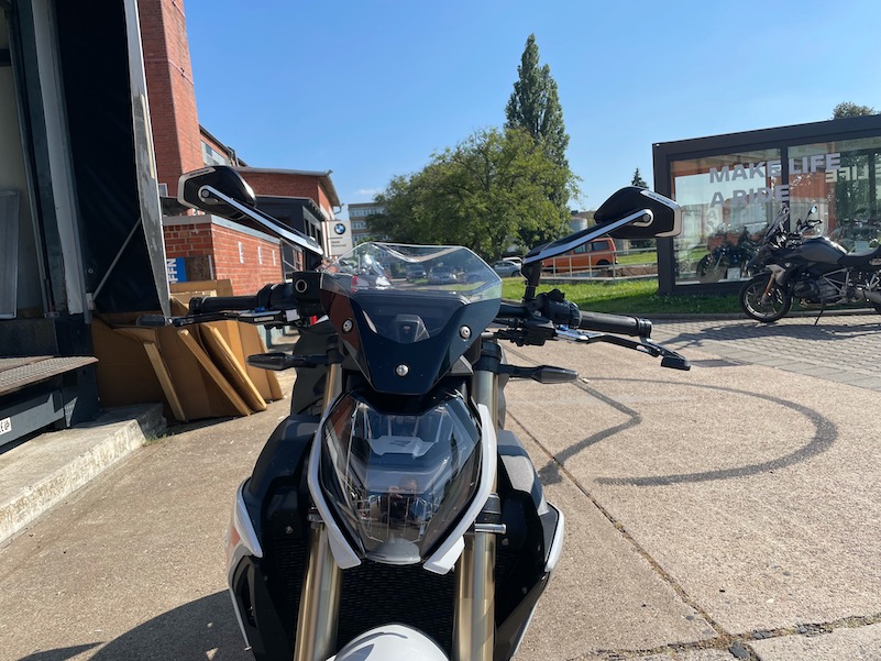 Und die Lenkerendenspiegel von BMW passen nicht mit den Handguards des Frästeile-Pakets.