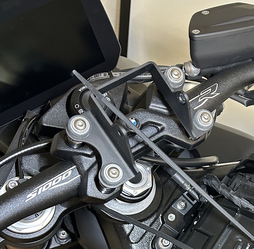 Der Alublock wird links und rechts an den Lenkerhalter der S1000R geschraubt (M5 Gewinde) und die Aufnahme fürs Navi mit 4 Schrauben draufgeschraubt.