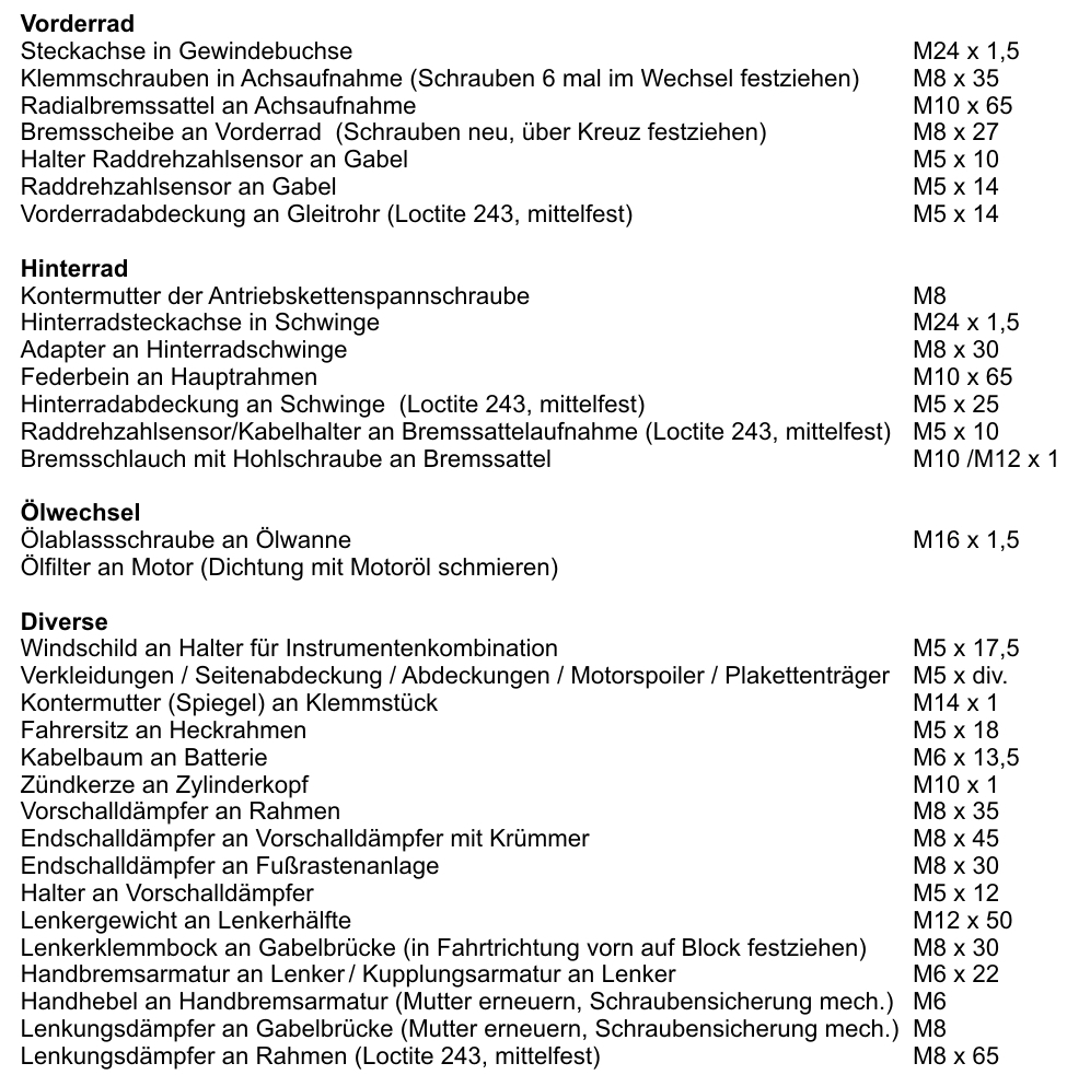 Die Werte, die man so im täglichen Leben braucht, also Radschrauben bzw. -muttern, Bremssättel, Verkleidung, Kettenspanner usw. hatte ich mir zusammen gesucht, daraus eine Liste gedruckt und diese unter die Sitzbank geklebt. Das fand ich recht hilfreich bei den normalen Schrauberarbeiten, die man so hin und wieder mal erledigen muss. Da ich bei meinen Mopeds immer Monk-mäßig-pingelig bin und immer alles super-korrekt machen möchte, war das eine ziemliche Erleichterung, nicht immer die Handbücher oder Werkstattanleitungen wälzen zu müssen.