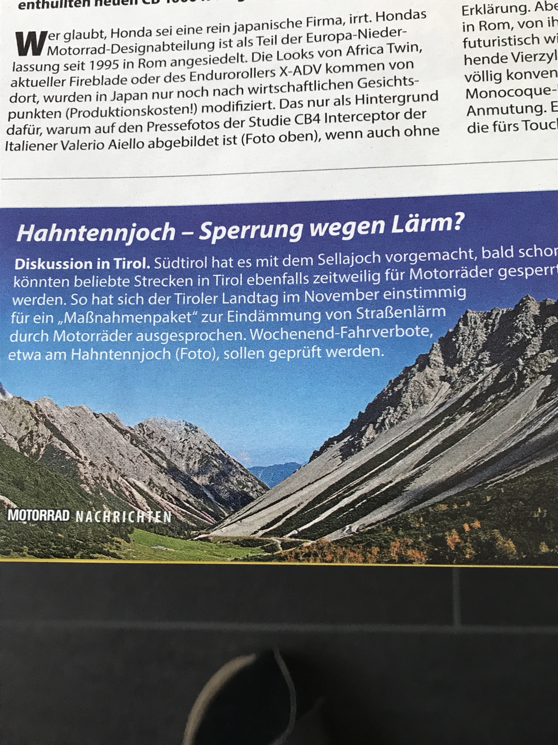 Und obwohl es hier eindeutig um den Lärm geht, wollen doch immer noch einige Biker unbedingt ne lautere Tüte an ihre Kiste schrauben. Sound gefällt mir auch aber die Zeiten sind nun mal vorbei (man stelle sich einfach mal der Realität). Und da ich auch in so einer Gegend wohne, verstehe ich die Anwohner schon. Stellt euch mal am Fuße des Gaichtpass (Weißenbach am Lech/Reutte) hin, da dreht ihr nach 10min durch! Diese ganzen Anträge auf Verbote werden allein durch Lärm ausgelöst (ein Rudel Elektrobikes würde kein Schwein interessieren, egal wie schnell die fahren)Fragt mal die Anwohner
