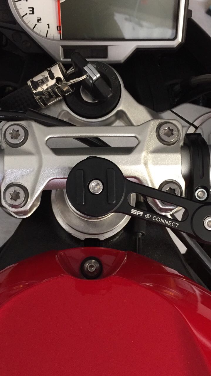 Habe ich auf der Tuono. Jedoch die Fahrrad Halterung direkt auf der Lenkerklemmung. Sitzt damit schön flach und dezent am Bike. Kann Bilder machen wenn du möchtest.