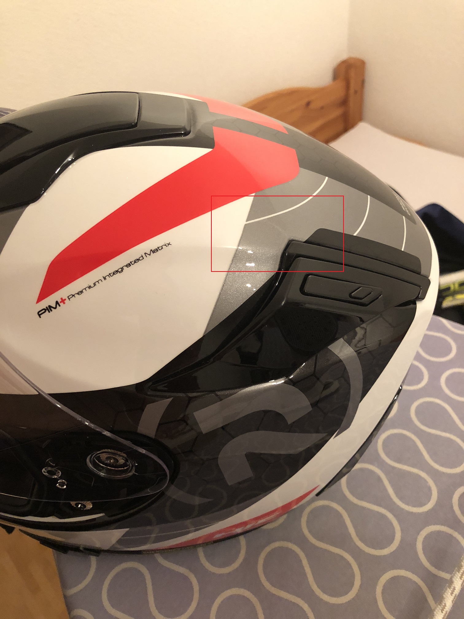 Auf anraten des Händlers orderte ich also einen vierten (und - so hoffte ich - letzten) RPHA 70 in der Farbe LIF / MC1. Zwei Werktage später war er da. Bereits am Telefon hat mir die nette Mitarbeiterin von Moto Mader erklärt, dass auch dieser Helm eine Macke hat. Es wurde ein Staubkorn oder ähnliches mit einlackiert.