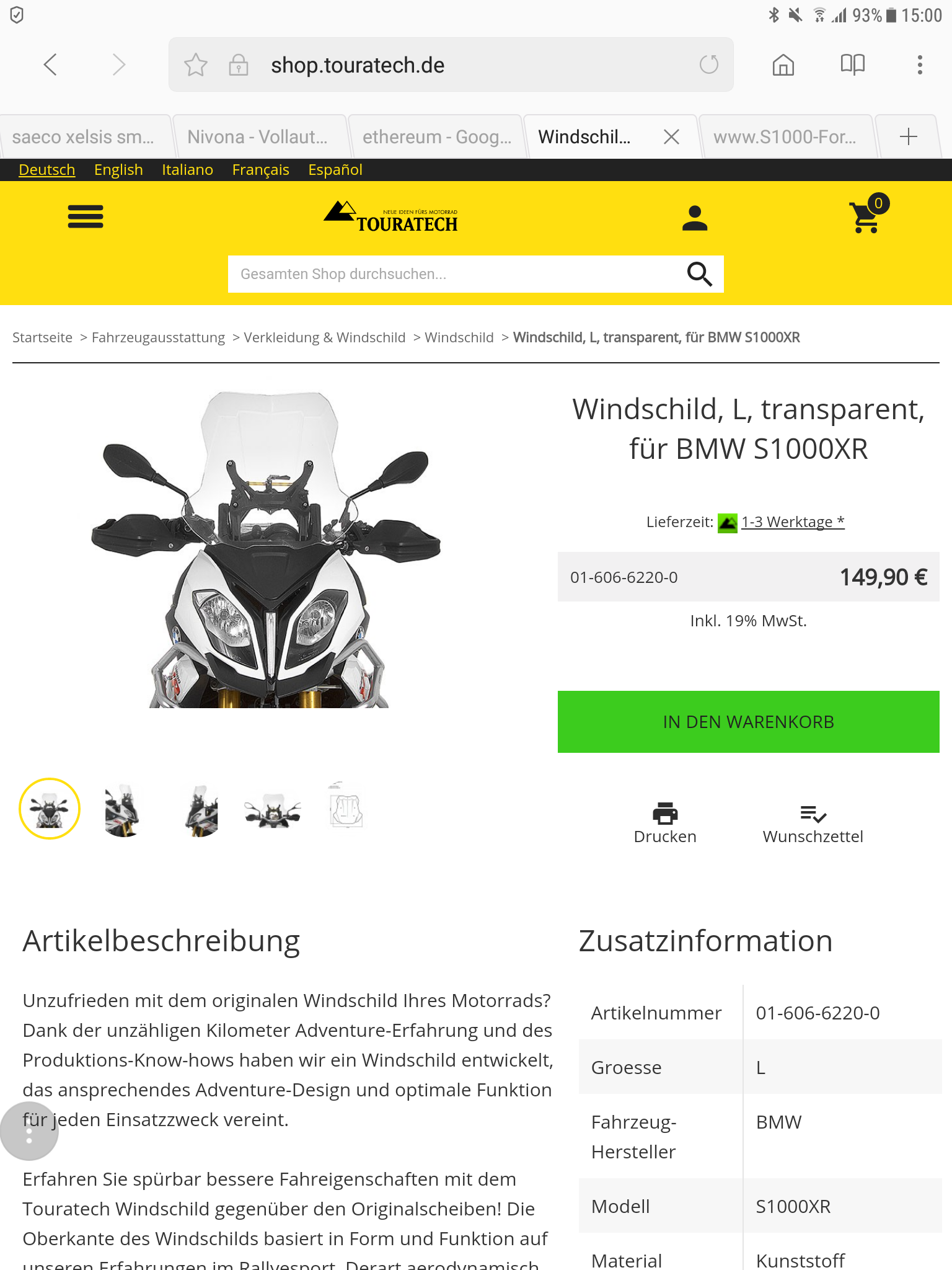 ...da ich aber gern wieder auf die Stöpsel verzichten würde und gern weiterhin die perfekte Lösung gefunden hätte, hab ich gestern die kurze Touratech Scheibe angebaut (https://shop.touratech.de/windschild-s- ... 000xr.html)...leider muss ich sagen, dass die Verbesserungen zur Wunderlichscheibe nur minimal vorhanden sind und im Grunde die Investition aus meiner Sicht nicht wirklich wert sind...Da es beim geschlossenen Visier aber doch nochmal a bissal besser geworden ist (werde auf langen Touren aber nicht auf die Stöpsel verzichten) und mir die Scheibe optisch sehr gut gefällt - stellt zum sportlichen Design der XR einen kleinen Stilbruch da und bringt ein bißchen Adventure-Optik mit sich - bleibt sie montiert...Die Verarbeitung ist wie erwartet gut und die Montage ist auch recht schnell (auch wenn die Montageanweisung im ersten Moment evtl kurz irreführend ist) erledigt...