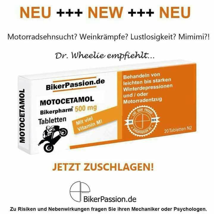 "Mann, wo hast du dir denn den Schnupfen eingefangen?" Antwortet ihm der erste: "Ich habe mich letzte Woche in den Schnauzer eines Motorradfahrers gesetzt, durch den Fahrtwind habe ich mich eben so erkältet."