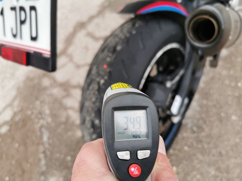 Eigendämpfung etwas besser. Spurtreu, leicht einzulenken. Schnell auf Temperatur. (Asphalt 9° Power 5 45°+ nach ca. 6 km Kurvenfahrt im 3. und 4. Gang)