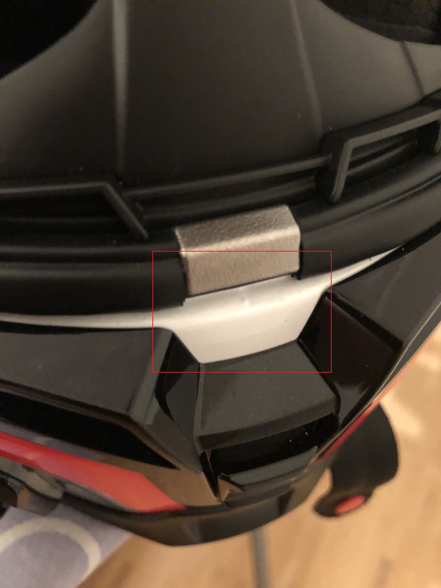 Zu Hause angekommen habe ich dann die Klebehalterung für die Gopro angebracht (zum dritten Mal) und die Lackierung (da neu) etwas genauer betrachtet. Dabei ist mir eine ca. 1.5 cm lange Delle / Kerbe auf der Oberseite des Helmes aufgefallen, die da definitiv nicht hingehört. Klar, man sieht es nicht, wenn man es nicht weiss... aber man kann es sehr gut ertasten und einmal entdeckt, fällt es einfach auf. Im Bild unten ist eine heller scheinende Kerbe / Delle / Dingsda erkennbar.