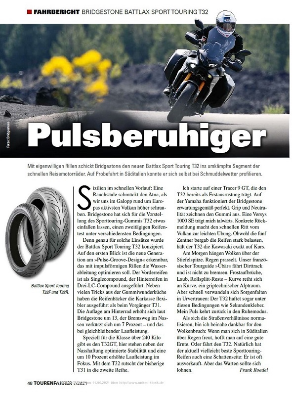 Aus dem Tourenfahrer 7-2021 untenstehender Bericht oder auch dieser Link: https://www.1000ps.ch/testbericht-30079 ... e-t32-test oder auch die website von Bridgestiône unter https://www.bridgestone.de/motorrad-rei ... attlax-t32