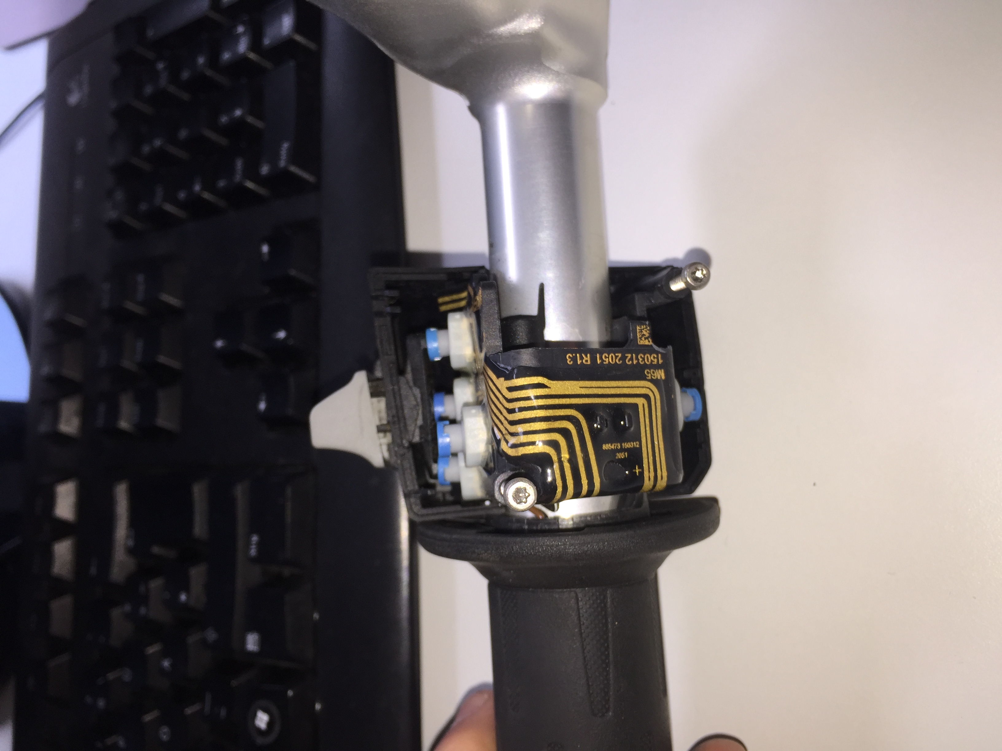 Griffgummi etwas umklappen, darunter befindet sich eine Schraube, hinausdrehen und Griff mit Schaltereinheit abziehen!