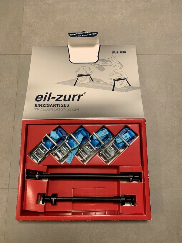 Das EILZURR®️ Verzurr-SystemSet besteht aus Steckachse für Vorderrad, Steckachse für Hinterrad und 4 Zurrgurte