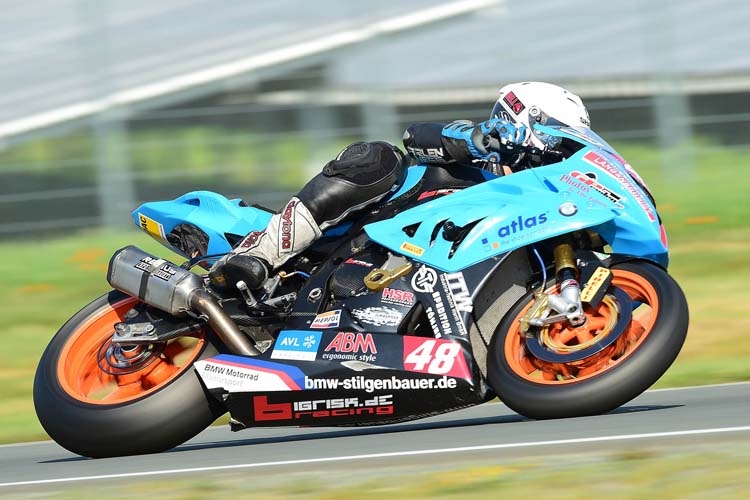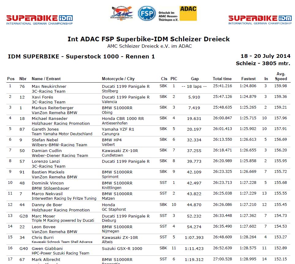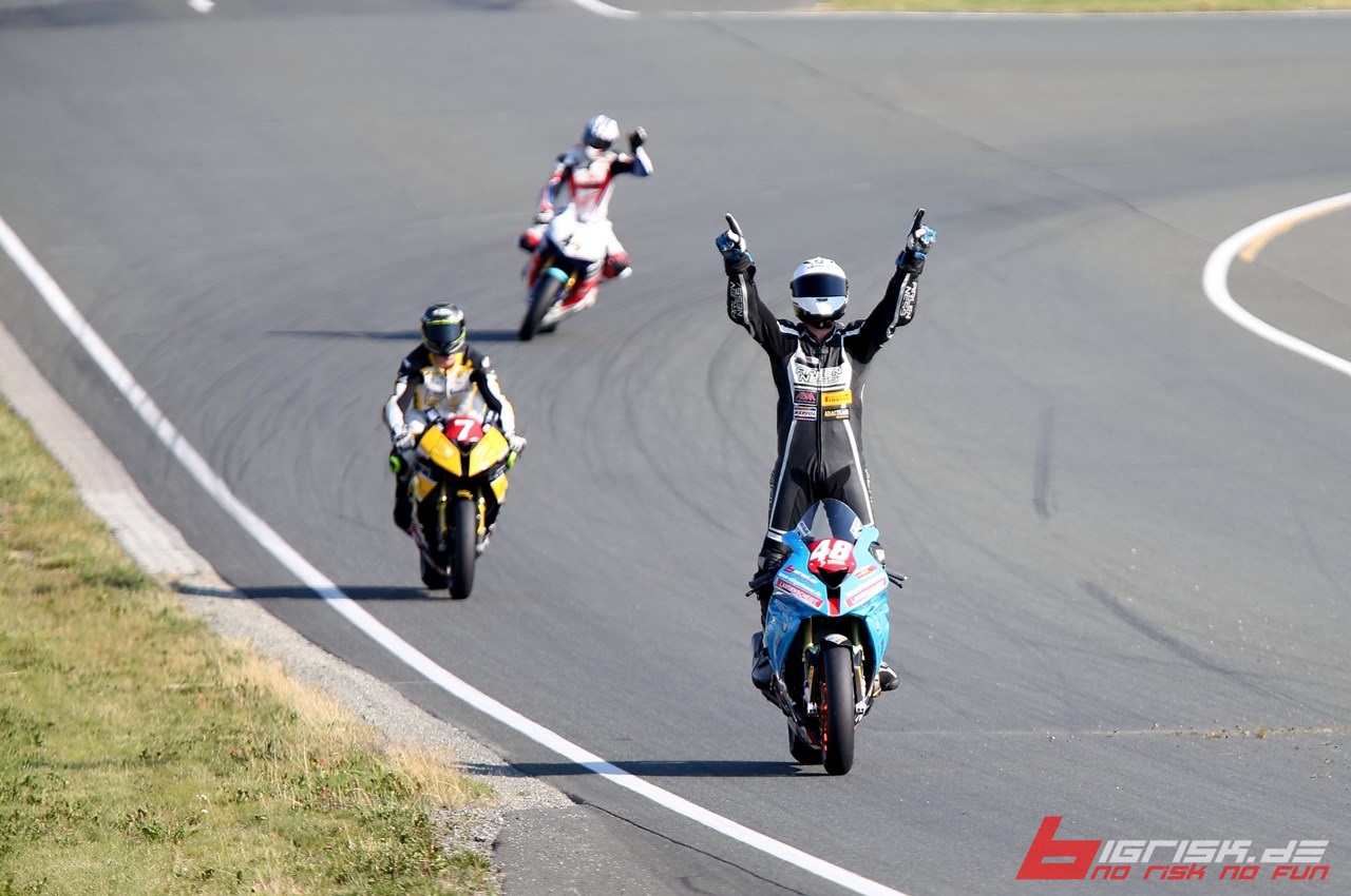 Schleiz: Hitzeschlacht ... 38 C° ... Q1 nicht optimal ... Qualifyer hat nicht gut gepasst ... P4. Q2 top, aber bei der Mittagshitze nicht mehr die Zeiten der ersten 3 unterbieten können ... Rennspeed top mit Rennreifen. Im Rennen dann bei tropischen Temperaturen auf Platz 1 gefightet ... endlich der verdiente Lohn. Race 2 ... schwierig, da die SBK-Piloten Smrz und De Boer im SST-Pulk mitten drin waren und Dominik trotz Top-Zeiten nicht zum Angriff kam. Zum Schluss dann noch von der 1199 von Marc Moser (Gaststarter FIM Superstock) abgefangen worden. Platz 3 ... aber 45 Punkte und zurück in der Meisterschaft auf Platz 3 vor Bovee (Alpha-Racing).