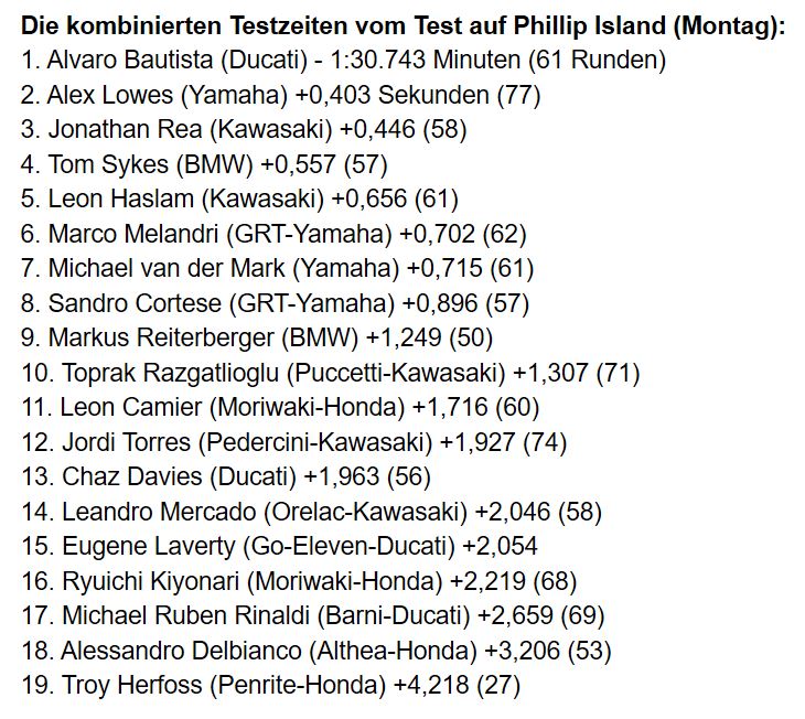 Ergebnisse aus dem ersten Rennen in Australien. Sykes auf Platz 7. Fehlt leider noch an Top-Speed, so wurde er zum leichten Opfer auf den Geraden. Aber das Jahr hat erst angefangen und Potential ist klar zu erkennen. Bautista mit der V4 ist der Hammer - 15 Sekunden vorne weg , da hat Rea dieses Jahr was zu tun
