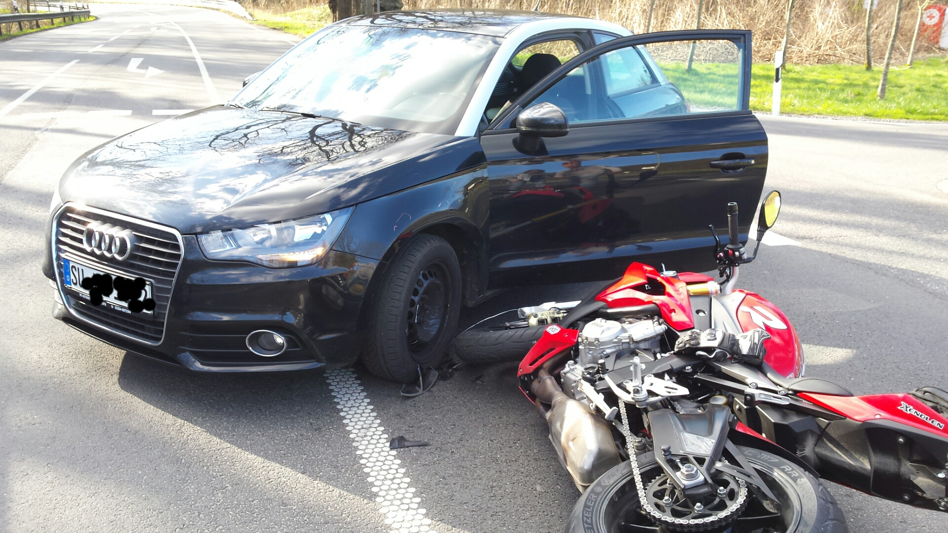 Bei der Heimfahrt war ich auf der Landstrasse (Vorfahrtstrasse) hinter einem VW Touareg her, der rechts abbiegen wollte. Aus der selben Ausfahrt stand ein A1 und wollte über meine Fahrbahn nach links abbiegen. Ich war mir 200% sicher, dass er mich gesehen hatte, da ich mit ihm Blickkontakt hatte, quasi über den Wagen, der vor mir gefahren ist. Audi stand noch da und hatte Blinker an. Während mein Vordermann rechts abbog, hatte ich den Audi für Bruch einer Sekunde nicht in Sicht und in diesem Moment ist er vorgefahren und war plötzlich vor mir. Ich konnte noch etwas abbremsen, aber bin trotzdem ihm in sein Vorderrad links reingefahren wie man auf den Fotos sieht.