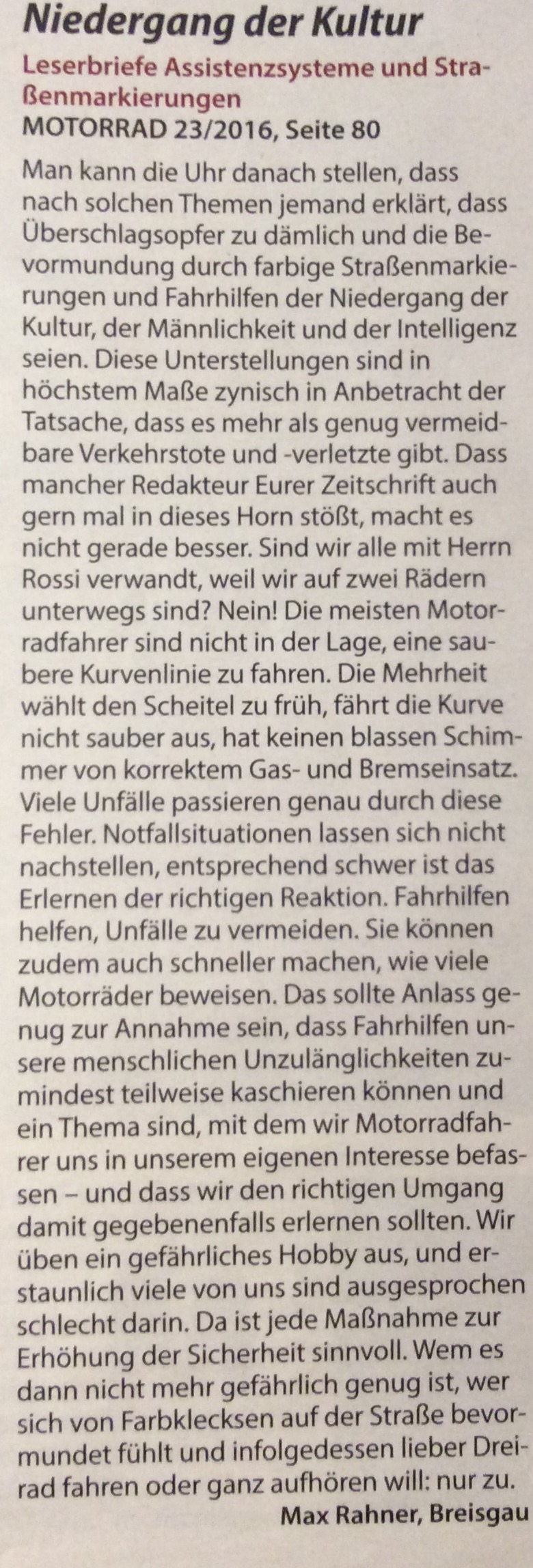 powerschmid2000 hat geschrieben:Irgendwie passt dieser Leserbrief aus der aktuellen Motorrad hier hervorragend rein. Ich kann ihn nur zitieren, besser Schreiben hätte ich es nicht gekonnt. Grüße Micha