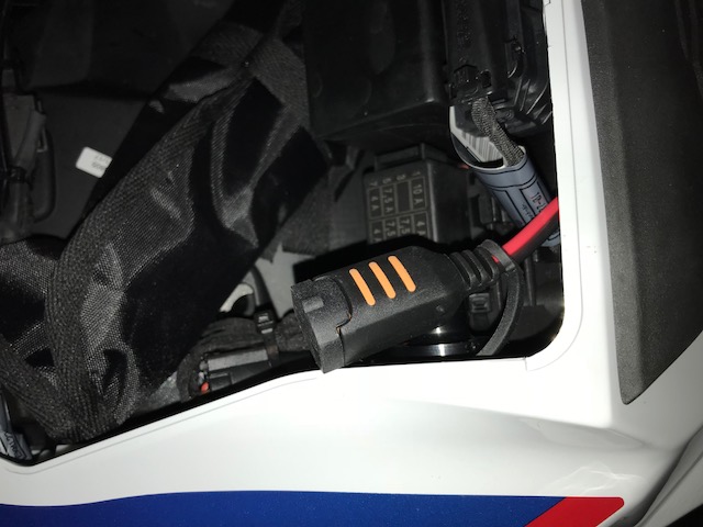 Erst einmal habe ich eine Ladebuchse an die Battrie angeschlossen, der Stecker liegt dann bei Nichtgebrauch unter dem Soziussitz.