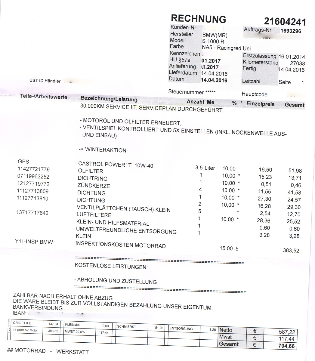 Bei allen Werkstattarbeiten an Motorrädern oder Autos hat die Kalkulation vor Auftragsvergabe immer gepasst bzw. es wurde noch ein Mangel während der Arbeiten festgestellt und nach telefonischer Rücksprache dann mit aufgenommen.