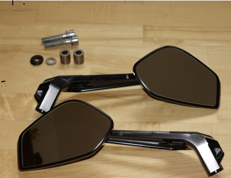 Das sind die Mo. View Sport. Gibt es- wie übrigens alle Spiegel von Motogadget- als Lenkerendenvariante, oder in gewöhnlicher Position mit Spiegelarmen in zwei Längenvarianten. Dazu in jeweils zwei Größen, einmal mit, einmal ohne E Prüfzeichen.