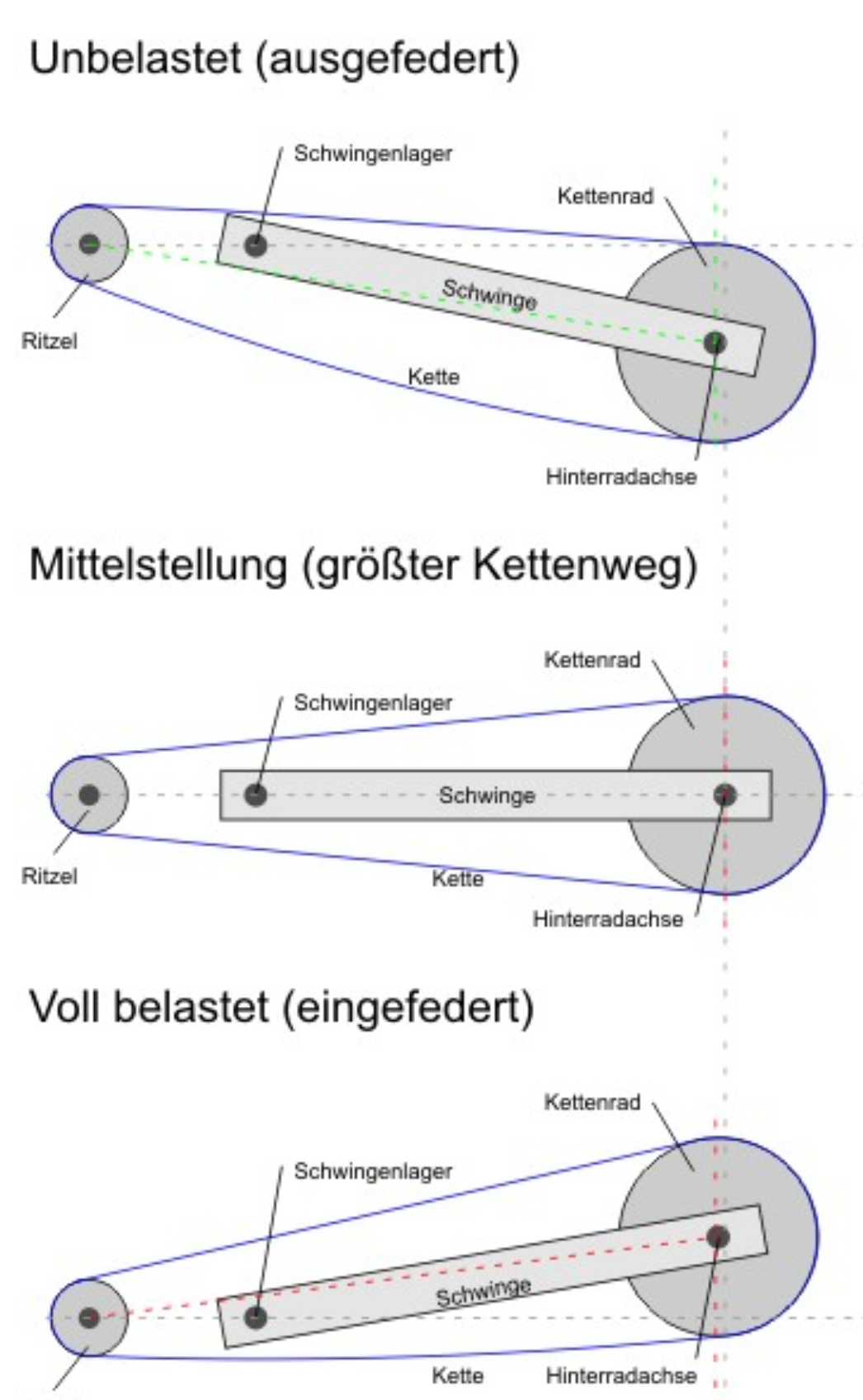 Entscheidend ist der Kettendurchhang in der Mittelstellung, siehe Bild. Er sollte mindestens 1 cm sein, am besten zwischen 1 und 2 cm liegen. Ob die Grundeinstellung auf dem Seiten-, Haupt-, Montage- oder Zentralständer vorgenommen wird, ist der Kette völlig gleichgültig, wenn der eingestellte Wert zum gewünschten Ergebnis führt!
