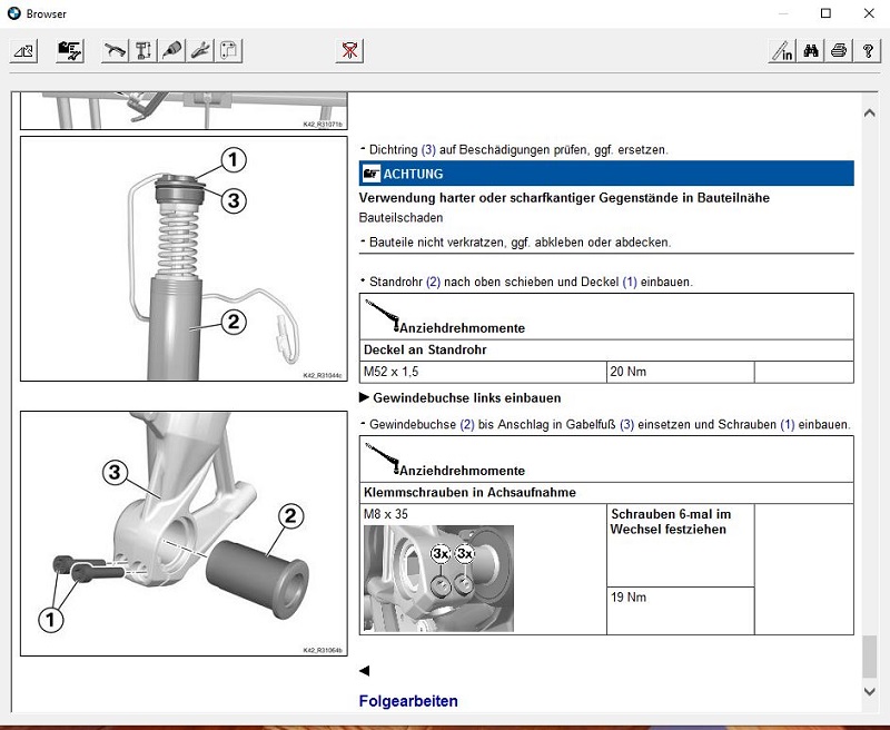 Anbei der Auszug aus der Reparaturanleitung für Einbau der Gewindehülse am linken Gabelfuß bei der S1000 R. Gewindehülse bis Anschlag rein und festziehen. Da ist auch nichts mit einstellen oder messen. Macht es mal nicht so kompliziert. ThumbUP