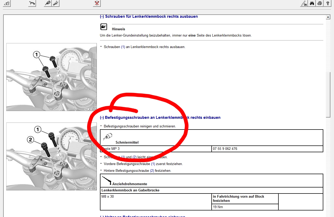 Wenn man in der Rep-Anleitung bei "Lenker austauschen" guckt, gehen die wohl davon aus, dass man die alten Torxschrauben weiter verwendet. Diese sind natürlich schon geschmiert (zumindest war es bei meiner Maschine so).