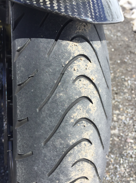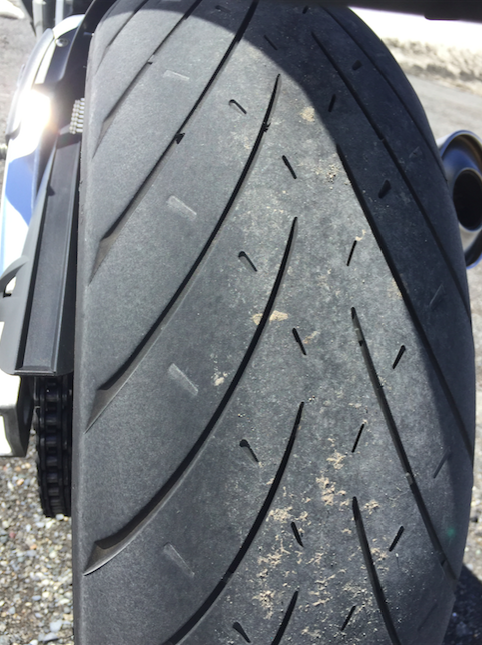 Mittlerweile ist der Reifen nahezu unfahrbar. Auf der Autobahn kein Problem - da wäre er noch für mehrere tausend Kilometer gut - aber in Kurven werden die Haltkräfte eines Eisenbiegers benötigt, und dann fährt er erst noch dahin, wohin er will und muss ständig nachkorrigiert werden. Katastrophenreifen ab - sagen wir - 4000 km. (Ich glaube, den würde ich nicht mal für ne Tourenmaschine ein zweites Mal nehmen.)