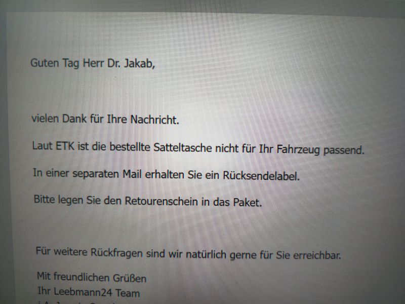 Weil ich gedacht habe ich blöd bin, habe ich am Wochenende dem Leebmann geschrieben, was das sein soll. Heute die Antwort, unten wunderschön zu lesen, die haben jetzt erst die Fahrgestellnummer und sowas geguckt, passt nicht. Zumindest offiziell nicht. Also ich weiß es nicht. Wie gesagt, irgendwie sitzt, aber gutes Gefühl habe ich dabei nicht, ich werde warscheinlich zurückschicken, und nach der SW Motech Variante gucken. Ich wollte die BMW Satteltaschen haben weil: bei der BMW können die Soziusfußhalter bleiben, bei der SW Motech nicht. Aber jetzt weiß ich leider Bescheid. Komisch ist es schon.