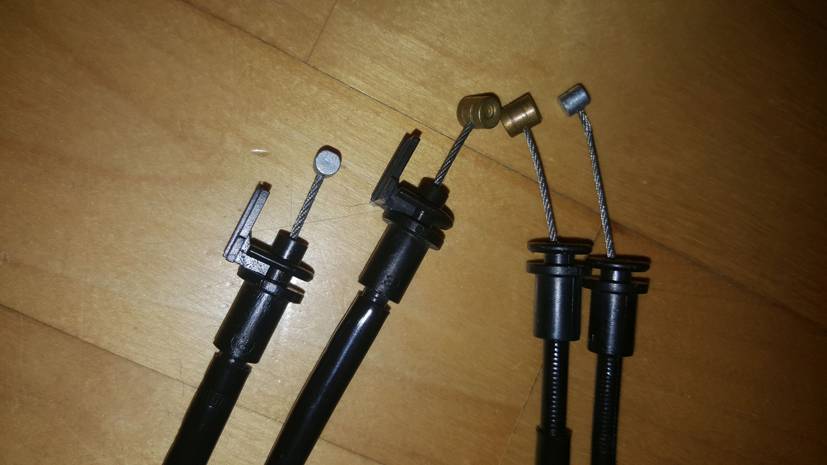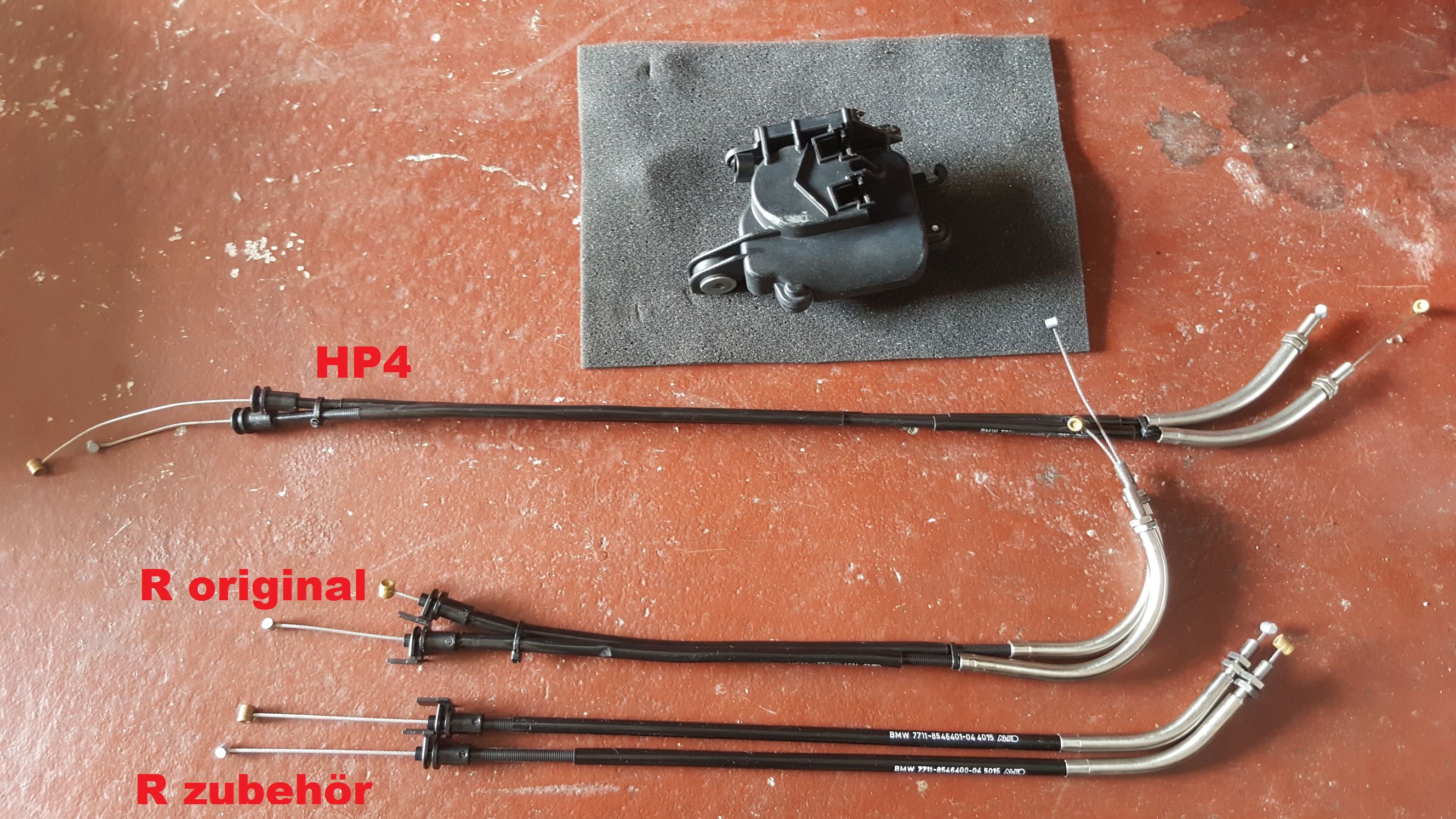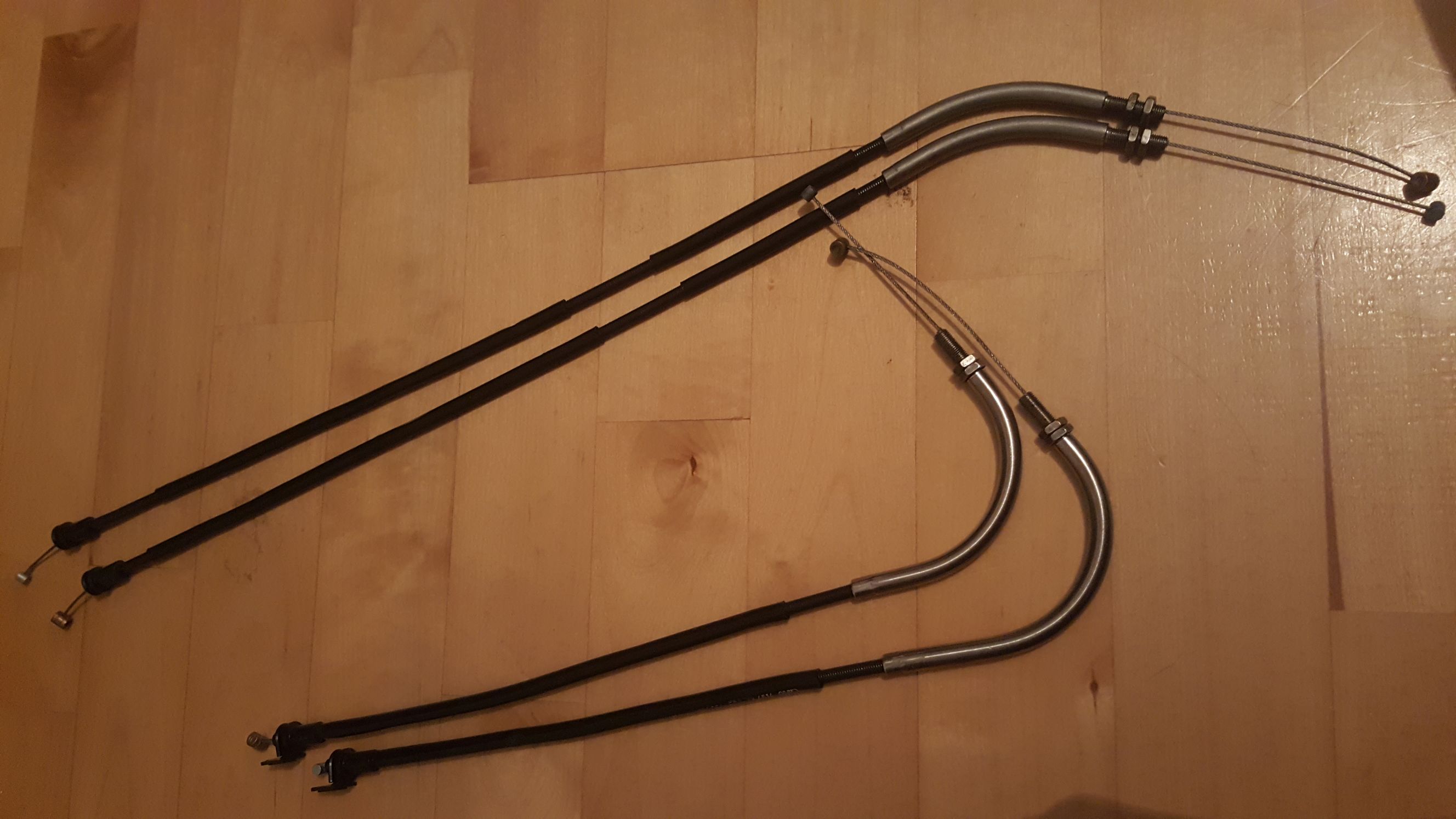Ich hatte ja wie bekannt bei Neukauf die HP-Titananlage gekauft, dort sind 2 neue Züge dabei gewesen. Diese passen in den Stellmotor bei der R hinter dem rechten Rahmen rein sowie in die Klappenstellung des HP-Rohrs.