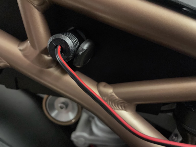 ich hab ein 1.8 m langes USB-Kabel unter der Sitzbank, an der rechten Seite entlang unter der Verkleidung nach vorne verlegt. Das Kabel kommt unter der vorderen Tankverkleidung in der Mitte, nahe dem Lenkkopf heraus, und alles funktioniert perfekt.