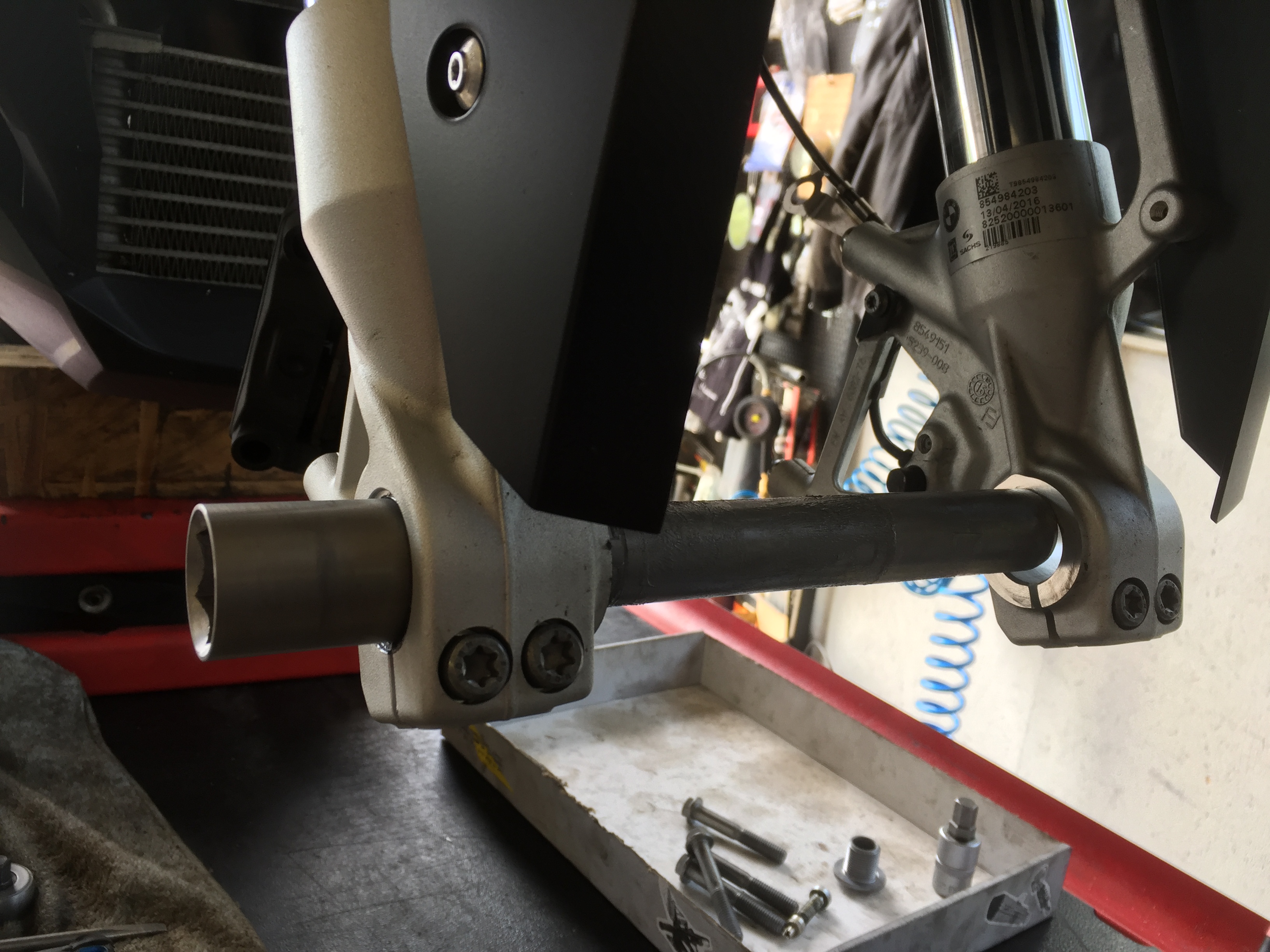 Hebt man das Motorrad vorne frei, wird die Gabel ja alleine schon durch das Gewicht des Rades komplett heraus gezogen.