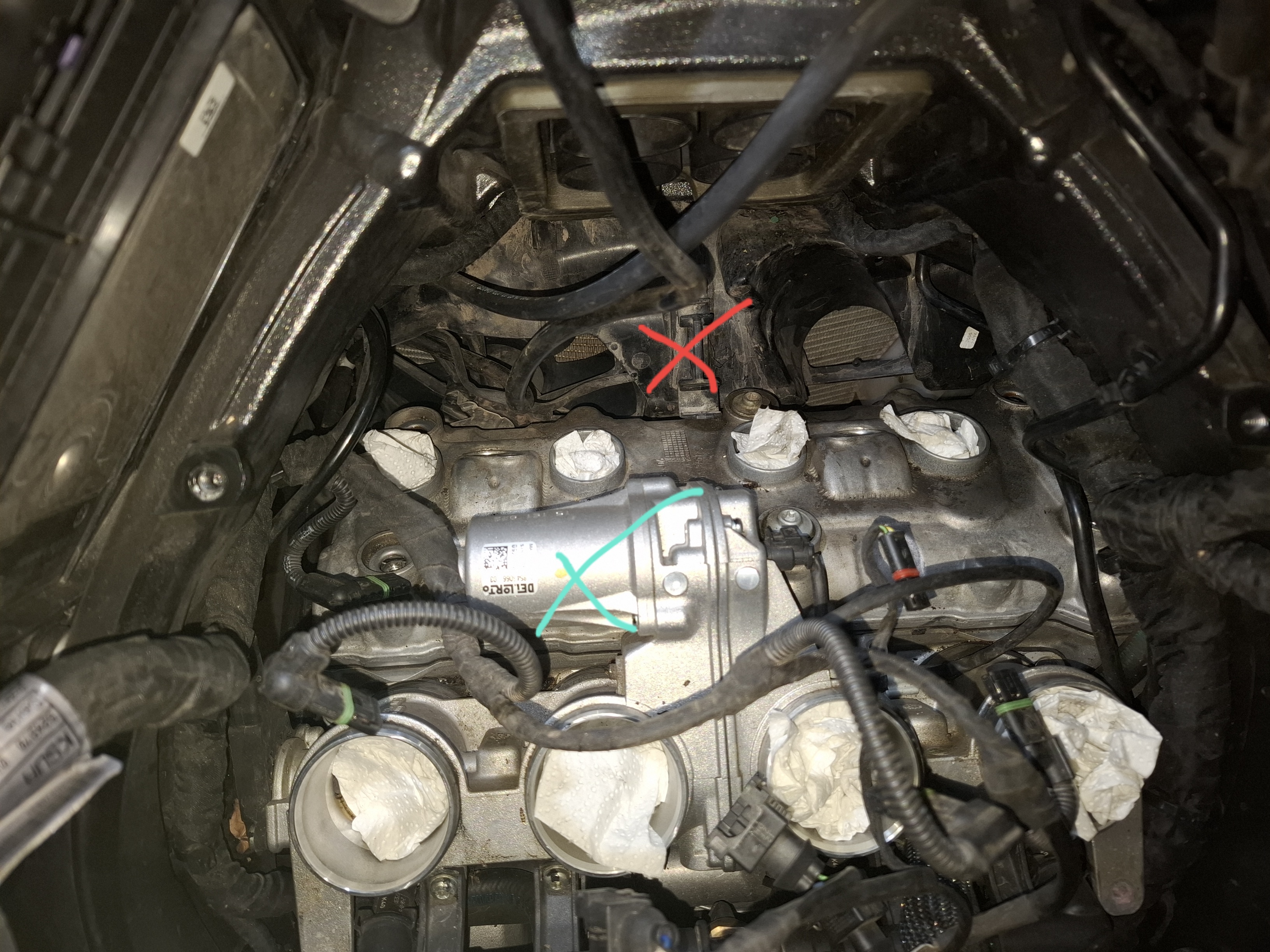 Vorn eine Leitungsfixierung an der Luftführung (rotes Kreuz).